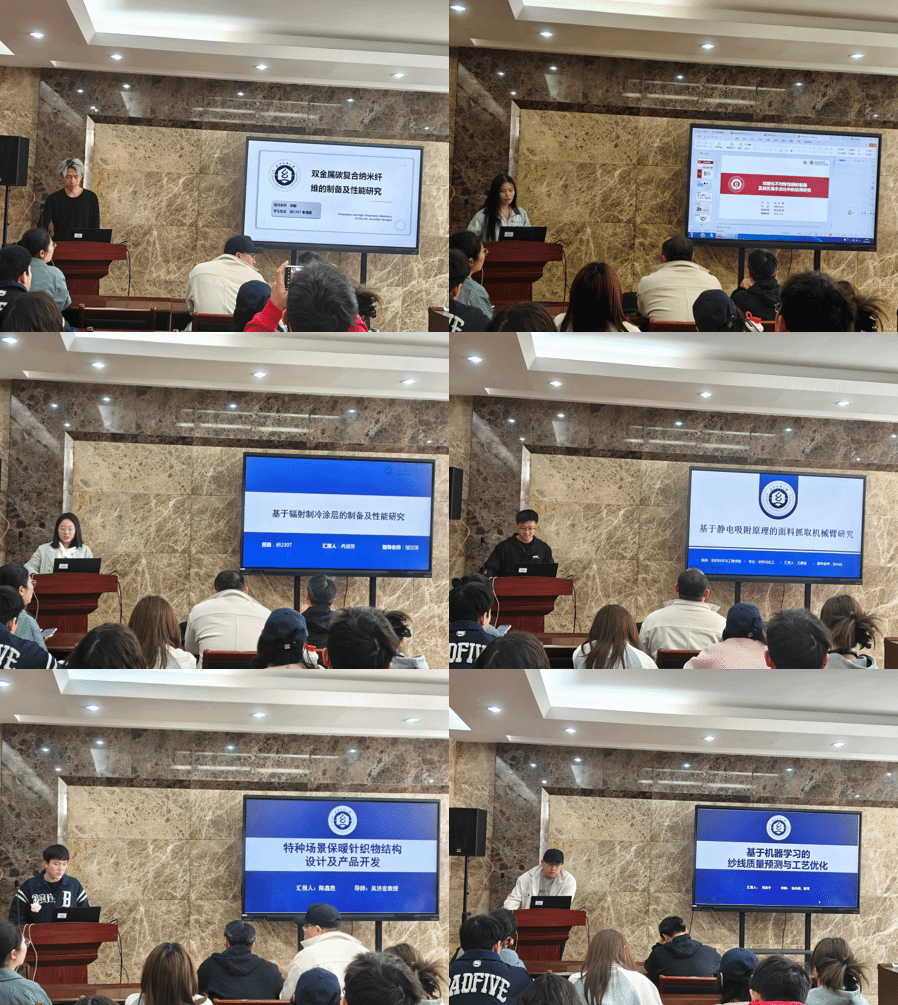 论坛上,李泽辰伍志喜冉淑贤王善滋陈鑫胜刘浩宇六位同学依次介绍了自己的研究课题和目前取得的研究进展,并分享了自己的科研经验。主讲同学的研究课题包括双金属碳复合纳米纤维材料及其性能研究、功能化不对称性膜的制备及其在海水淡化的应用、辐射制冷涂层的制备及性能研究、基于静电吸附原理的面料抓取机械臂研究、特种场景保暖针织物结构设计及产品开发、基于机器学习的纱线质量预测与工艺优化,契合了“纺织新材料及绿色加工”主题,代表了学院最新研究进展,参会人员积极提出问题和建议,营造了良好的学术氛围。