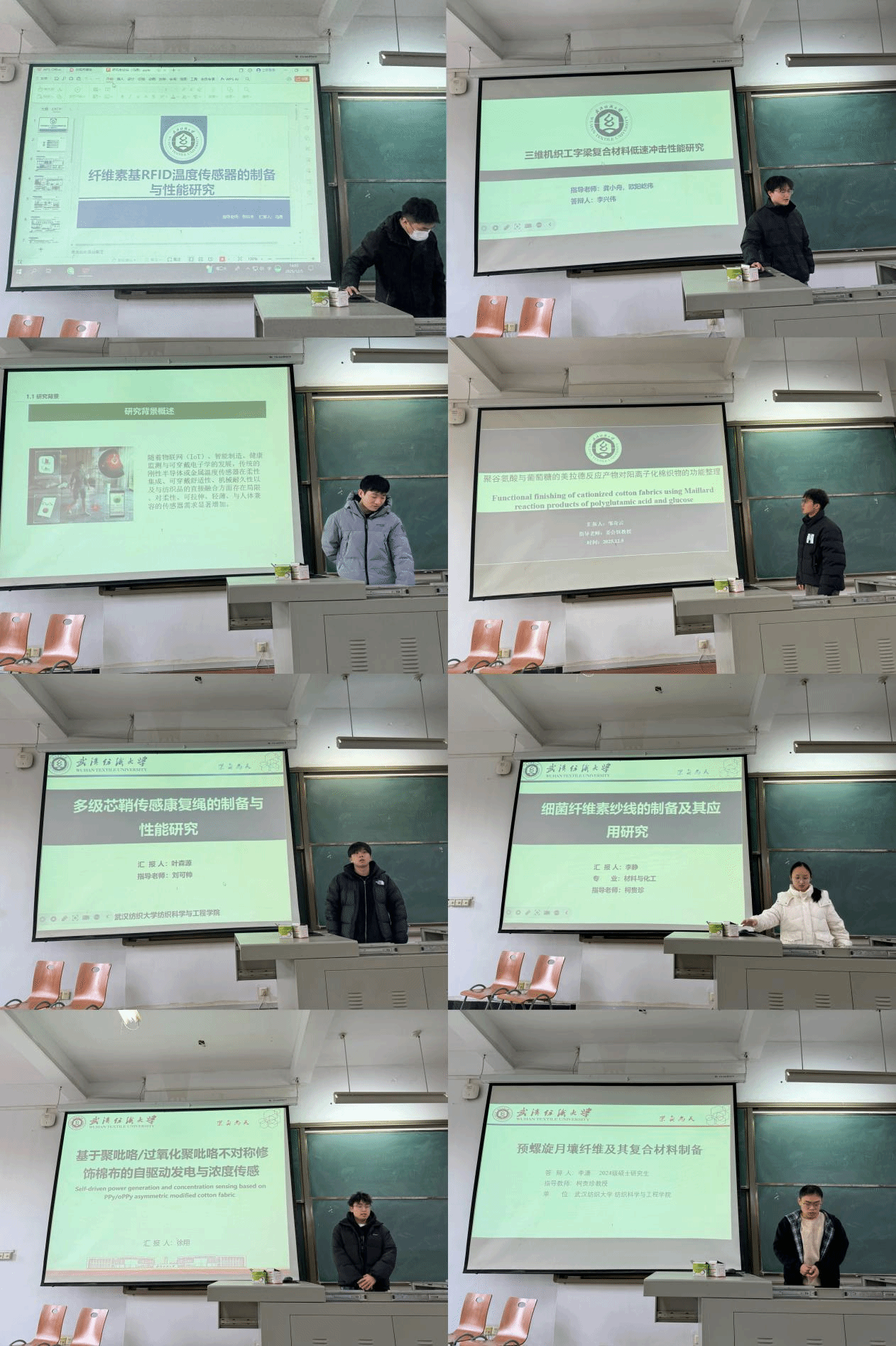 论坛上,冯源、李兴伟、胡海波、邹奇云、叶森源、李静、徐翔、李潇八位同学依次介绍了自己的研究课题和目前取得的研究进展,并分享了自己的科研经验。主讲同学的研究课题包括纤维基RFID温度传感器制备与性能研究、三维机织工字梁复合材料低速冲击性能研究、基于Janus结构纤维的温度传感特性研究、聚谷氨酸与葡萄糖的美拉德反应产物对阳离子化棉织物的功能整理、多级芯鞘传感康复绳的制备与性能研究、细菌纤维素纱线的制备及其应用研究、基于聚吡咯/过氧化聚吡咯不对称修饰棉布的自驱动发电与浓度传感、模拟月壤纤维增强复合材料制备与性能研究,契合了“纺织新材料及绿色加工”主题,代表了学院最新研究进展,参会人员积极提出问题和建议,营造了良好的学术氛围。