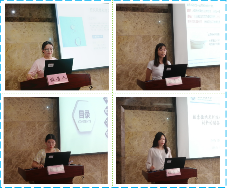 论坛上,周敏、周水清、龚林红、黄傲四位同学分别介绍了自己的研究课题和目前取得的研究进展,并分享了自己的科研经验。主讲同学的研究课题涵盖了石蜡材料、纳米纤维材料、丝素蛋白等领域,契合了“纺织新材料及绿色加工”主题,代表了学院最新研究进展,营造了良好的学术氛围。