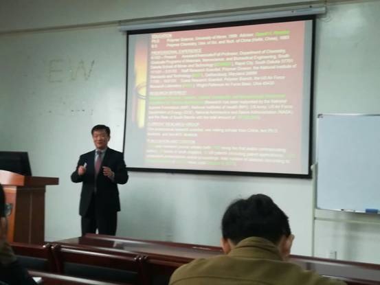 师生做“浅谈静电纺丝与纳米纤维的发展史和现状以及电纺材料的应用领域和产业化”的讲座,冯教授主要从纳米纤维的定义和性质、静电纺纳米纤维的制备方法、电纺材料的应用和目前产业化的情况做了介绍。下午2:00,冯教授在学院楼8H 504与教师就静电纺研究相关问题进行了学术交流。期间,肉视频