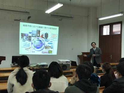 讲座上,鲍教授主要介绍了日本纺织的起源、纺织人才与社会就业需求、日本世界化学纤维生产量,介绍了复合材料的优势以及其在未来社会发展中的巨大潜力。鲍教授通过丰富的实例向大家介绍了碳纤维复合材料的应用价值,与师生们分享了FRP抗压缩性能的研究,最终采用包芯纱的纺制方法找到了合适的纱线,满足了拉伸和压缩平衡。