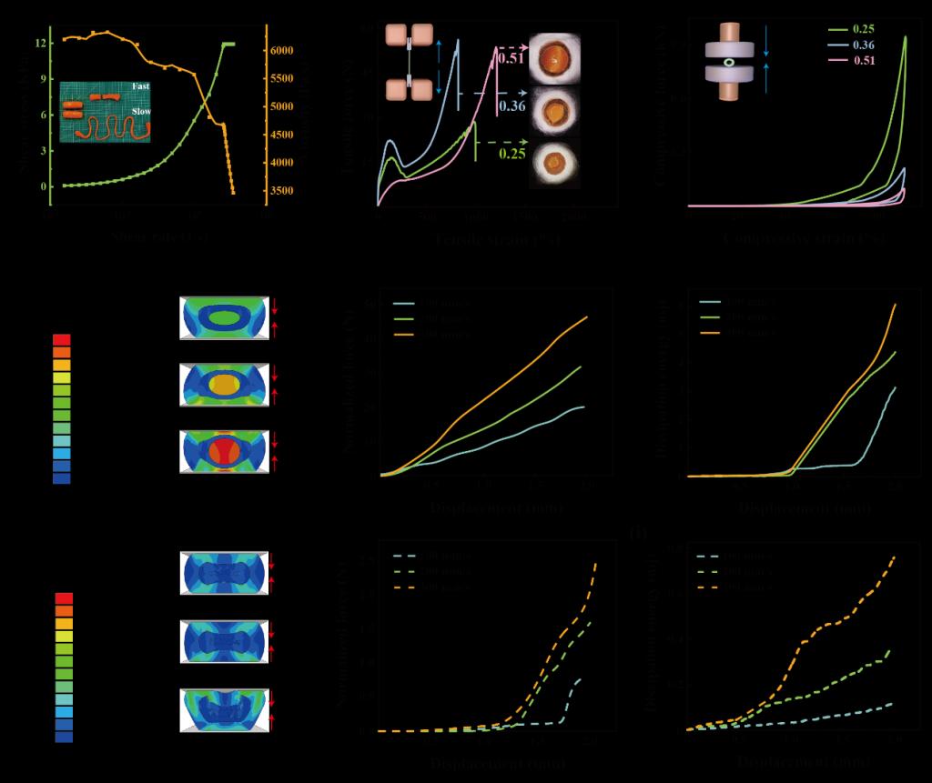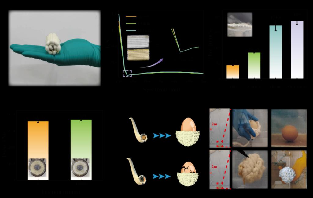 织物实验表征结果表明:STF织物(STFF)具有柔软可折叠(图3a)、耐洗(图3b)、透气透湿(图3c)、接触舒适性;在保护性方面,STF织物(STFF)的抗冲击性和能量吸收能力都有所提高,可吸收73.5%外力,高于现有其它相关文献报道的抗冲击防护指标效果(图4c),因此STFF有效防护了生鲜鸡蛋从2米高度自由落在硬质地面上,仍保持完好无损(图3e)。机理模拟分析表明(图4g):STFF的耗能机理归因STFY的纱线表层变形和芯层STF 剪切增稠的结合。因此经过万次摩擦后,STFF表层毛羽增多、表层结构更松软,吸能及抵抗外力防护效果稍有提升(图3d)。