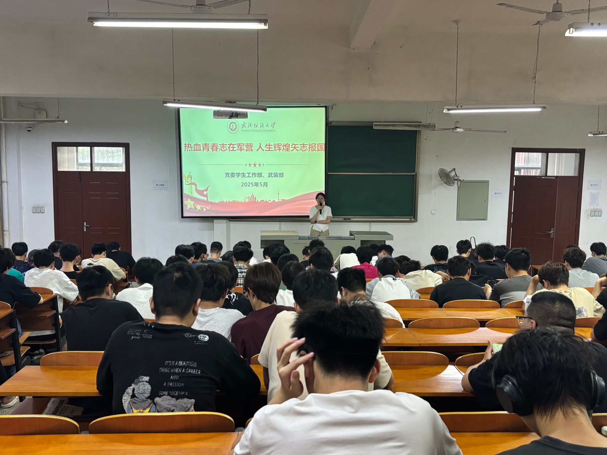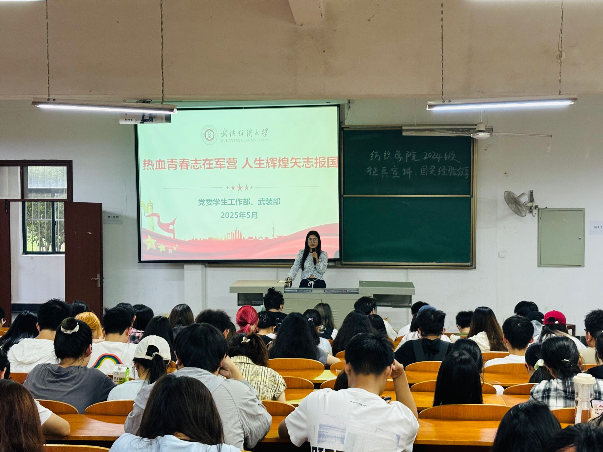 为积极响应国家号召,激励青年学子投身国防事业,为实现建军一百年奋斗目标贡献青春力量,5月11日,纺织学院开展了“热血青春志在军营,人生辉煌矢志报国”主题班会。本次班会由各年级辅导员、班主任主持,全体学生共同参与。