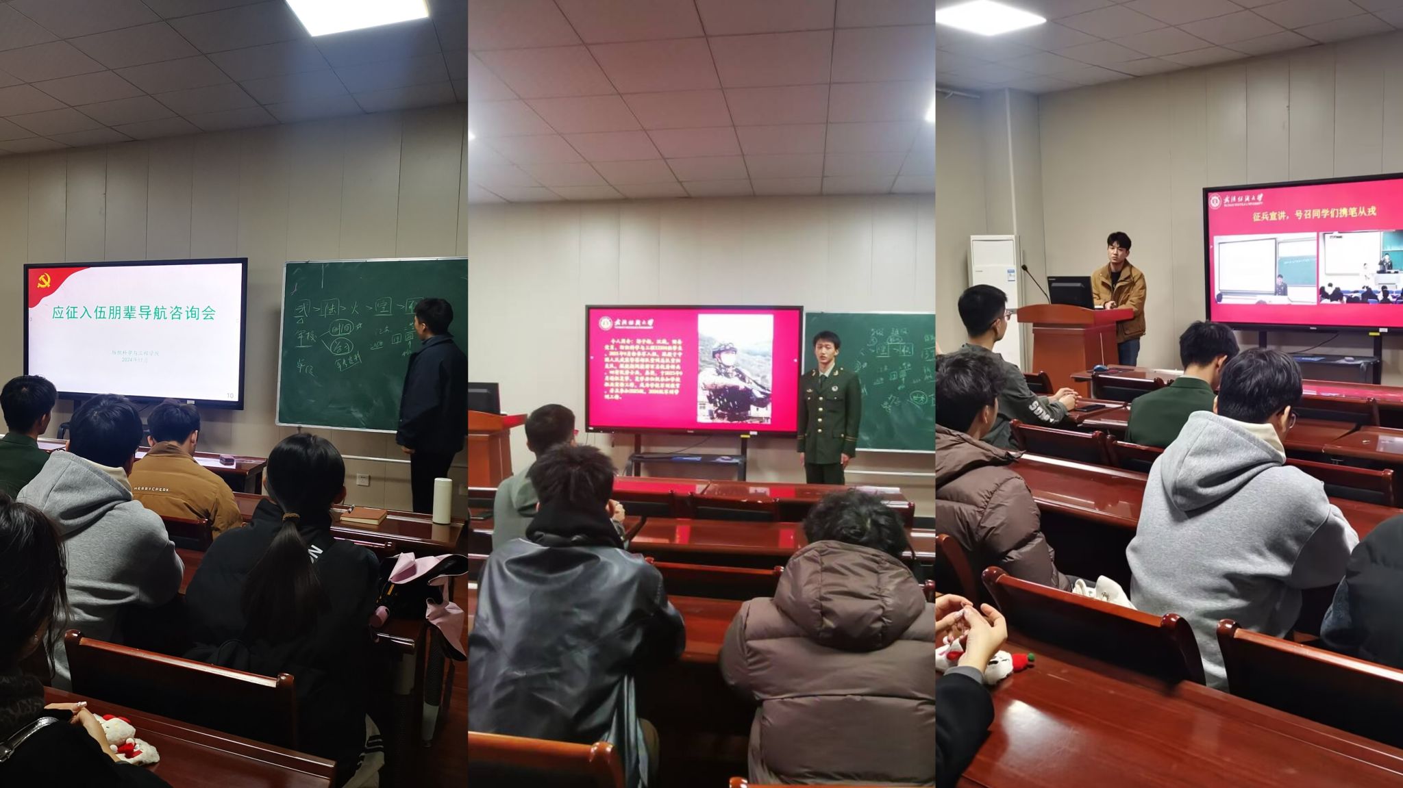 按照学校武装部的统一部署,各年级辅导员近期为本年级所有学生开展了一场题为《热血铸军魂 报国正当时》的宣讲,从习近平基于新时代青年的寄语“坚定理想信念站稳人民立场  练就过硬本领投身强国伟业”,到《中华人民共和国兵役法》、军兵种介绍,最后到入伍流程及大学生参军优惠政策等。各年级老师强调,青年大学生应该了解国防、学习国防、参与国防。肉视频 优秀退役大学生士兵郭子扬同志分批参加了各年级宣讲大会,根据自身当兵的经历详细解说了入伍政策、军队工作和生活等情况,并与辅导员老师共同为同学们解答关心的问题。