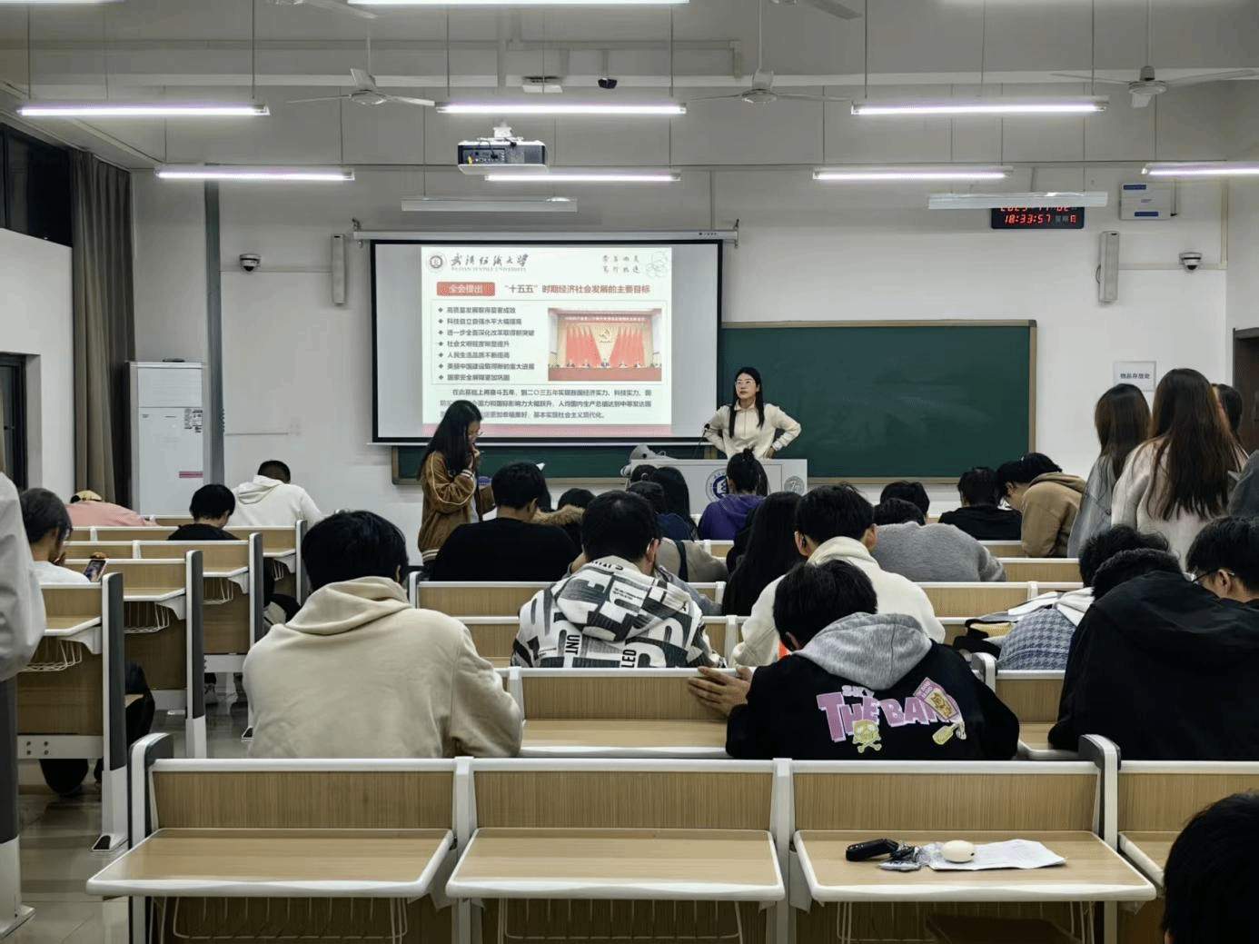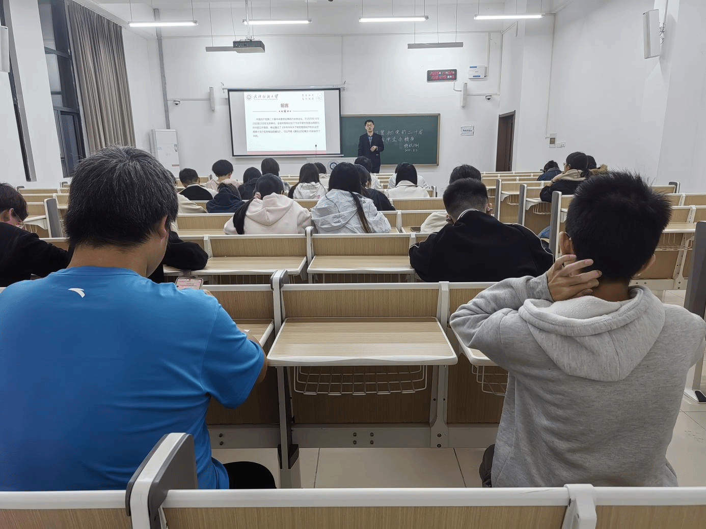 班会上,辅导员、班主任老师带领同学们认真学习了党的二十届四中全会公报的核心内容,围绕“十五五”时期经济社会发展指导思想、基本原则和主要目标展开系统讲解。通过理论阐述与要点梳理相结合的方式,帮助学生精准把握全会精神实质,帮助学生准确把握全会精神的实质内涵,深刻认识全会在推进国家治理体系和治理能力现代化进程中的里程碑意义,切实增强对全会精神的政治认同、思想认同和实践认同。