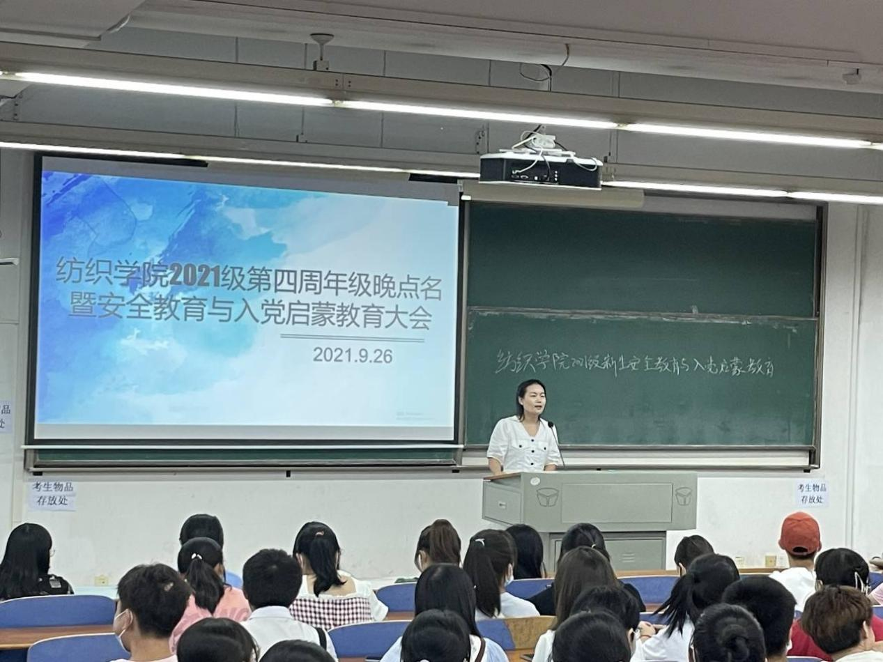 为帮助新生充分适应大学生活,了解学院学生管理制度,增强其安全意识、提升其思想认识,结合社会时事上好“大思政课”。纺织学院于26日晚召开了2021-2022学年年级晚点名暨新生安全教育与入党启蒙教育大会。会议由2021级辅导员张竣青主持,全院2021级新生参加。