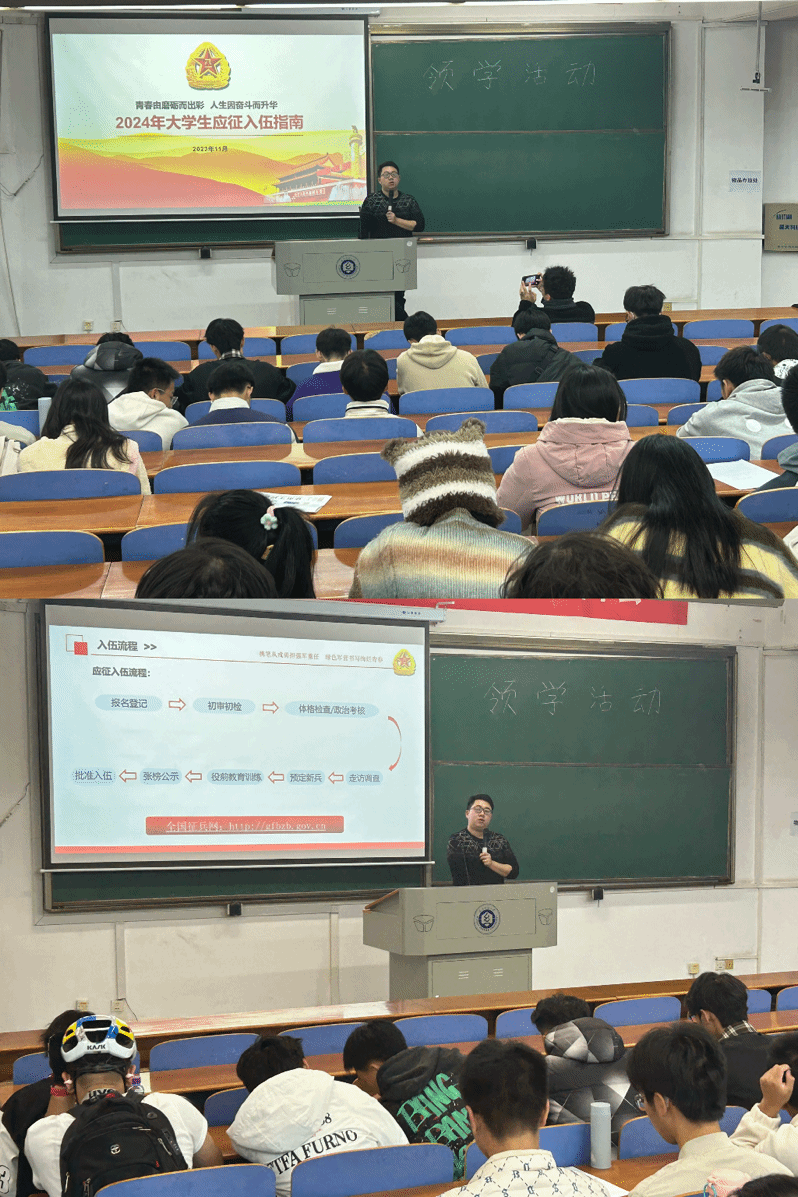 为鼓励同学们积极入伍,11月26日晚,肉视频 在YG-T101开展了“2024年大学生应征入伍指南宣讲”大会。23级辅导员余国铖、向婷及23级全体同学共同参与。