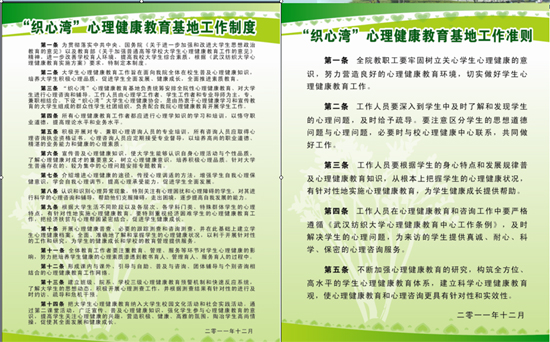 经过近一年的精心筹备和试运营,在校党委和学工部的领导和大力支持下成立了“织心湾”心理健康教育基地,同时获批校学生工作特色基地重点项目,面向全校学生开展心理健康教育和心理咨询服务。