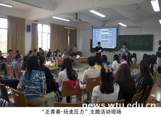为不断培养学生积极心理品质,创新心理健康教育形式,丰富主题班会内容,纺织学院“织心湾”心理健康教育基地在全院开展心理健康主题班会系列活动。5月12日下午,学院举办了一场名为“正青春-玩走压力”的特殊班会活动。