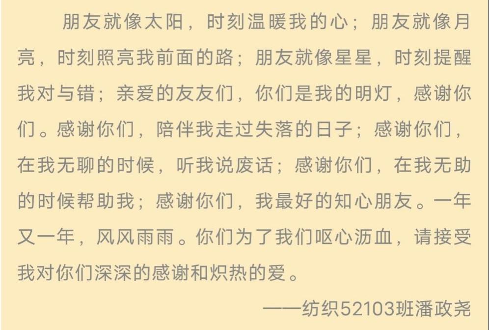 本次活动感恩节活动让纺院学子向自己的家人,老师,朋友表达自己的感恩之情,也让大家明白只有怀着感恩之心去对待生活才会感受到更多的美好,才会拥有更健康的心理品质,才会为自己的成长奠定更坚实的基础。相信本次活动之后大家会更加积极向上,充满阳光!