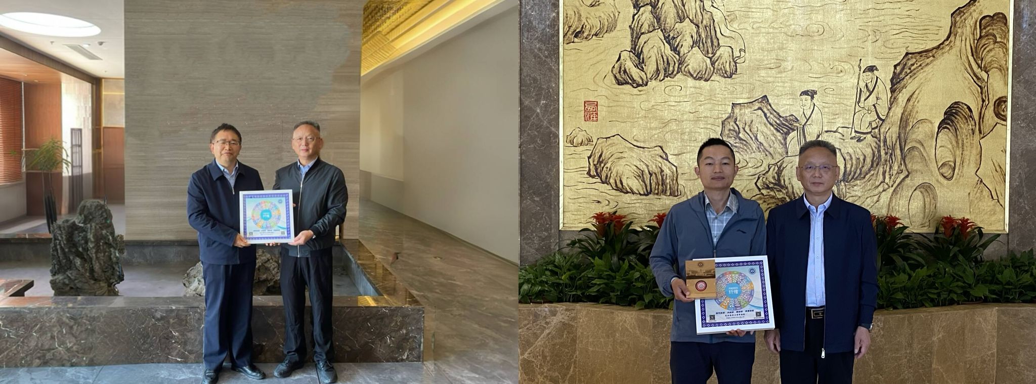 罗锦银向校友赠送纺织纤维轮和玄武岩版校徽