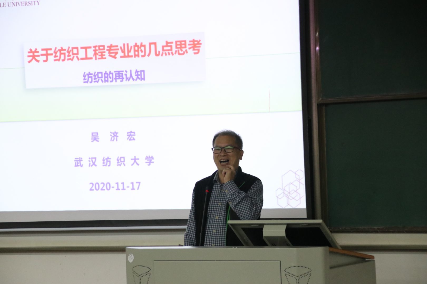 为了让同学们更加深入地了解纺织工程专业,纺织学院于11月16日上午9点,在3H102开展了“纺织再认识”讲座,本次讲座出席的人有教授吴济宏,党委副书记陈海书记和辅导员吴童玲,讲座由吴济宏主讲。