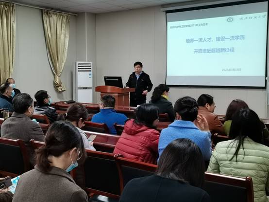 3月18日下午,纺织学院在8H502召开教职工大会,学院党委书记张红鑫为全院教职工做动员报告。