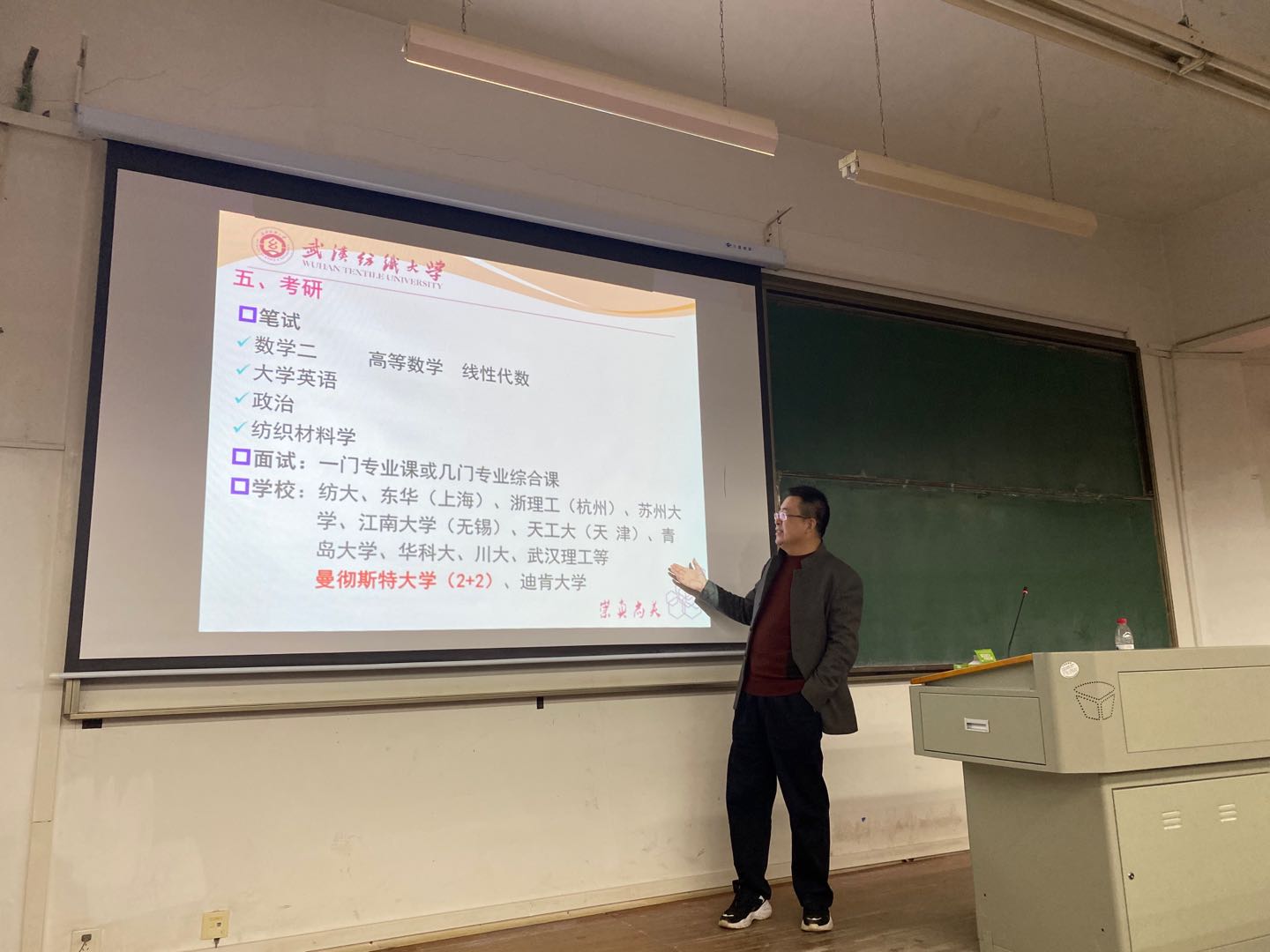 讲座伊始,武继松为同学们详细介绍了纺织类专业的涉及学科、考研方向、专业优势以及就业方向和工薪待遇等等。接下来,武继松重点对纤维轮进行了阐述,从基础课程,专业基础课,专业课程,创新创业课程,实践课程,全面介绍了纺织类同学在大学期间会接触到的课程,然后概括了纺织学院的专业成果,教学成绩,课程成效等体现教育质量的重要指标。强调了讲述纺织学院作为肉视频