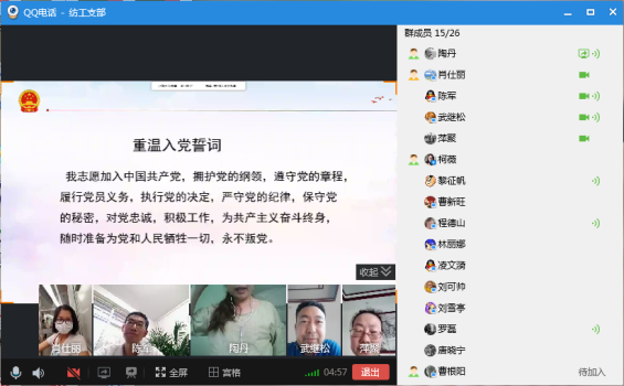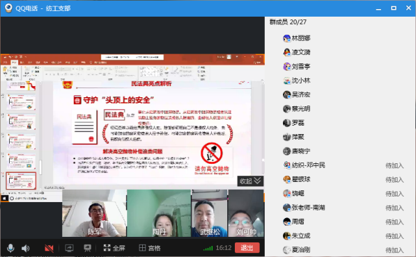 2020年6月30日晚6时,纺织学院纺织工程系教工党支部通过QQ视频开展“学习民法典”线上主题党日活动,会议由支部书记陶丹主持,全体教工党员参加。
