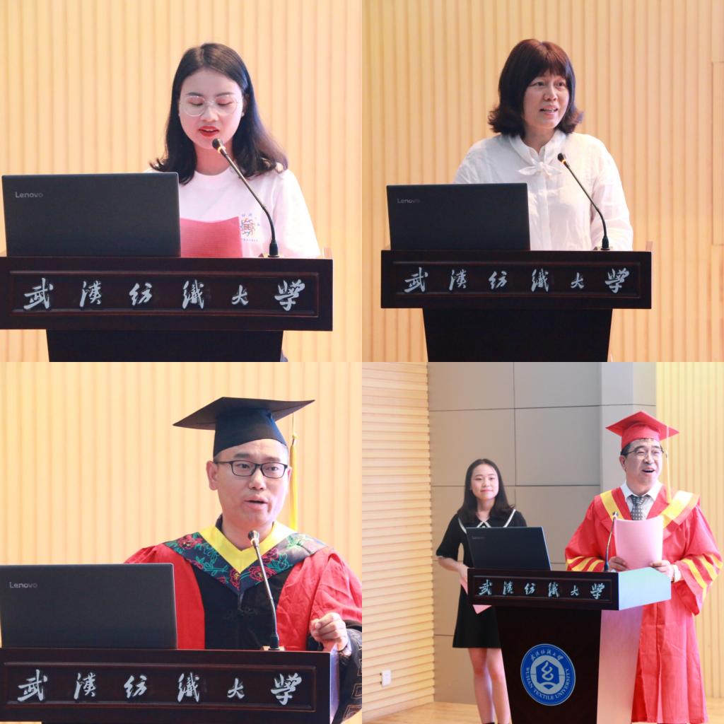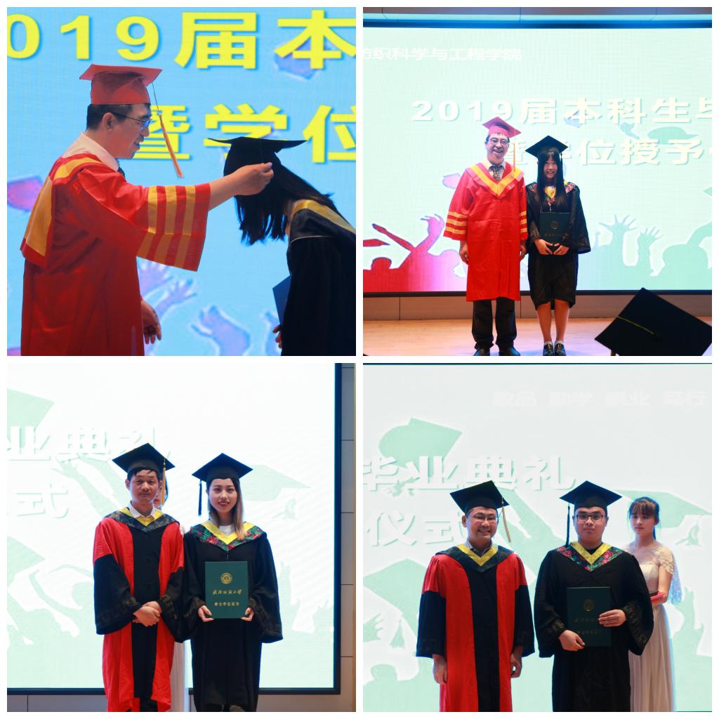 最后,举行学位授予仪式。纺织工程系系主任曹新旺、非织造材料与工程系系主任周阳逐一为毕业生颁发学位证书,张尚勇院长依次为学士学位获得者拨穗、正冠,合影留念。