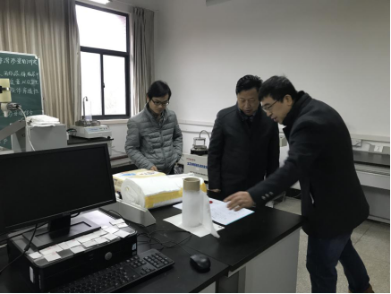 座谈会开始前,程碧海书记参观了纺织学院实验室。
