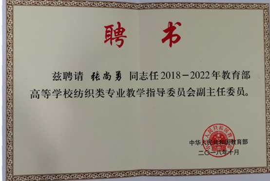 推荐的张尚勇教授经教育部遴选后聘请为副主任委员。中国纺织服装教育学会会长倪阳生、东华大学副校长舒慧生及17所举办纺织本科教育的高校教指委成员参加了会议。