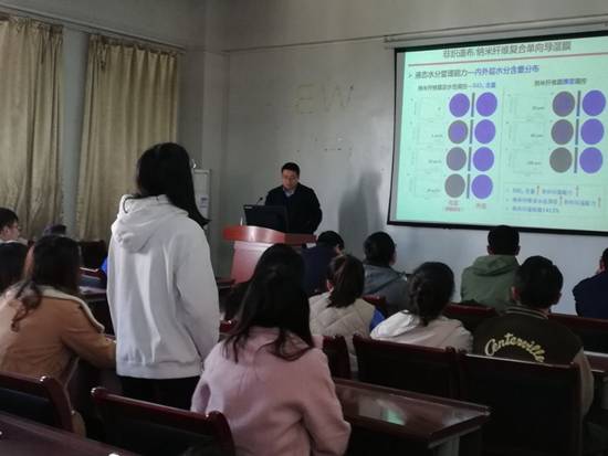 师生带来了“静电纺微纳米纤维材料的功能表/界面调控与应用” 学术讲座。讲座由纺织学院副院长张强主持,张尚勇书记/院长和部分老师也参加了此次讲座。