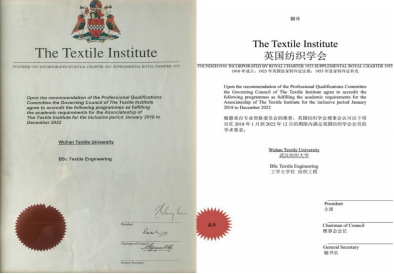纺织工程专业已获得英国纺织学会(The Textile Institute)工学学士学位认证。