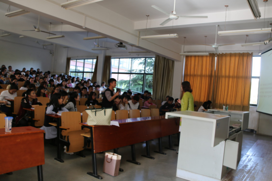 冯悦老师在演讲中谈到,一个人说话的谈吐,必将是影响着整个人气质的提升。她特别强调了普通话在每个人生活中扮演了怎样的角色,如何更好的去纠正自己的发音,更好的提升个人魅力,是完成个人未来规划的一大亮点。同时,她结合大学生的生活现状,热心地接受同学们对朗读技巧以及对她播音生涯的提问,一帧帧鲜活的人生经历展现在同学们的面前,深入浅出,娓娓道来。其中她特别总结到她的成功真谛,指出每一份努力的梦想都在坚持中逐渐磨砺出自己的硬度。为了满足大家对播音以及说话方式对人的改变有多大的好奇,冯悦老师与现场学生开展了“口音纠正”互动,气氛活跃。活动过程中,冯悦老师更是殷切地向在座热爱朗诵的学生表达了她的寄望。“身体与灵魂,总有一个在路上,选择静心阅读与激情朗诵的人,必然是丰满的灵魂者”,她动情的说道。