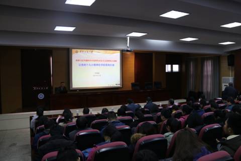12月7日上午,纺织学院、材料学院全体教职工及部分学生骨干代表在行政楼二楼学术报告厅,听校党委常委、副校长罗锦银关于党的十九大的辅导报告, 罗锦银为大家作了题为“高举习近平新时代中国特色社会主义思想伟大旗帜--让党的十九大精神在学校落地生根”的辅导报告。