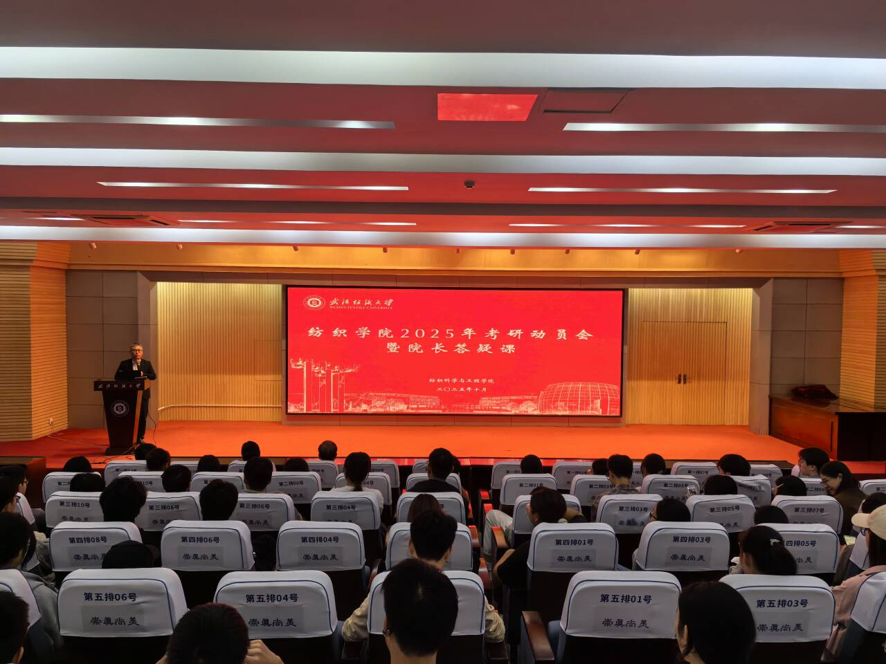 学子把准考研方向,科学规划备考,深入了解学科前沿,坚定升学深造信心,10月15日,纺织学院在国际学术报告厅举行了2026届毕业生考研动员暨经验分享会。学院党委书记朱张军、副院长(主持工作)夏治刚出席,学院教师吴济宏、毕曙光教授和两名优秀在读研究生作了交流分享。2026届全体考研学生参加了此次会议。