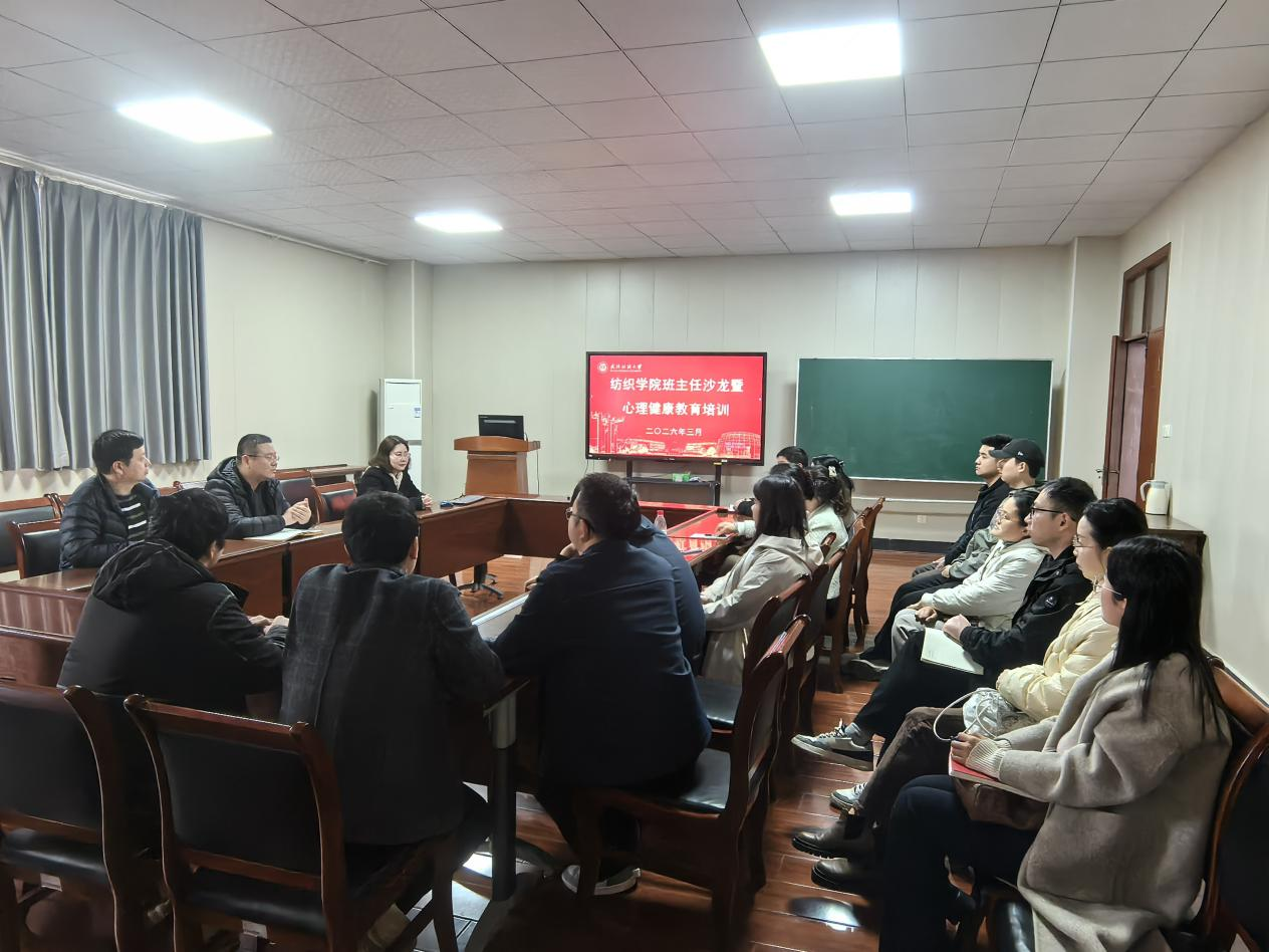 为进一步加强班主任队伍建设,提升心理育人工作实效,筑牢学生心理健康防线,3月27日下午,纺织学院举办班主任沙龙暨心理健康专题培训。校心理健康教育中心主任江秋玮副教授受邀作《看见,才有可能改变——班主任心理危机识别与应对技巧》专题讲座,院党委书记周洋、副书记赵亮、本科生班主任、研究生德育导师参加培训。