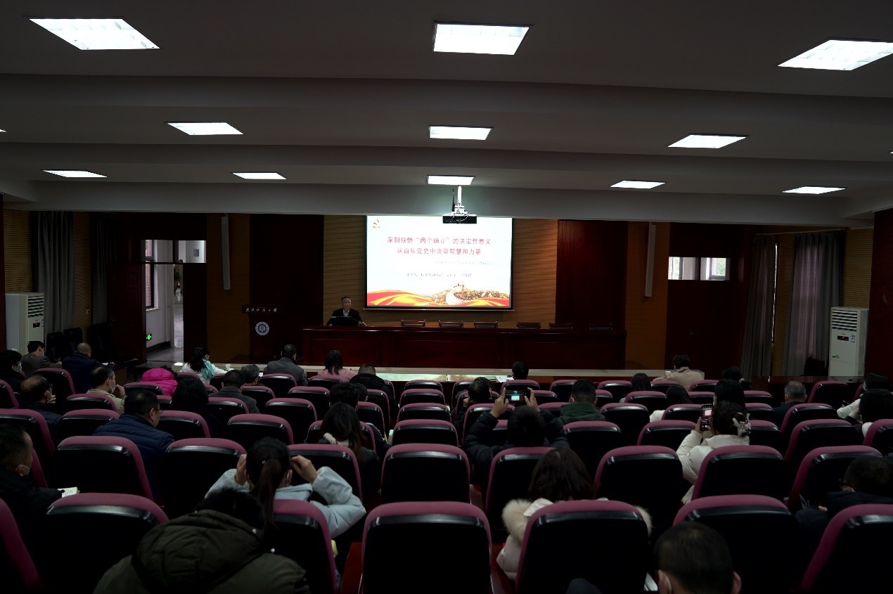 罗锦银以深刻领悟“两个确立”的决定性意义为切入点,从整体把握党的十九届六中全会概况、深刻理解三个“历史决议”中的“两个确立”、深刻认识“两个确立”的重要意义、坚决捍卫“两个确立”做到“两个维护”等四个方面进行对党的十九届六中全会精神进行了全面系统宣讲。重点将党的十九届六中全会审议通过的《中共中央关于党的百年奋斗重大成就和历史经验的决议》进行了数字化解读,并通过梳理百年党史,深刻理解《关于若干历史问题的决议》、《关于建国以来党的若干历史问题的决议》、《中共中央关于党的百年奋斗重大成就和历史经验的决议》,号召广大党员同志坚定拥护党中央的领导核心,把捍卫“两个确立”真正转化为做到“两个维护”的思想自觉、政治自觉、行动自觉,把学习领会党的十九届六中全会精神转化为建设美好纺大的行动指南,坚定“一二三四五六七”发展思路,坚持“三步走”发展战略,同心建设中国梦的纺大新篇章。