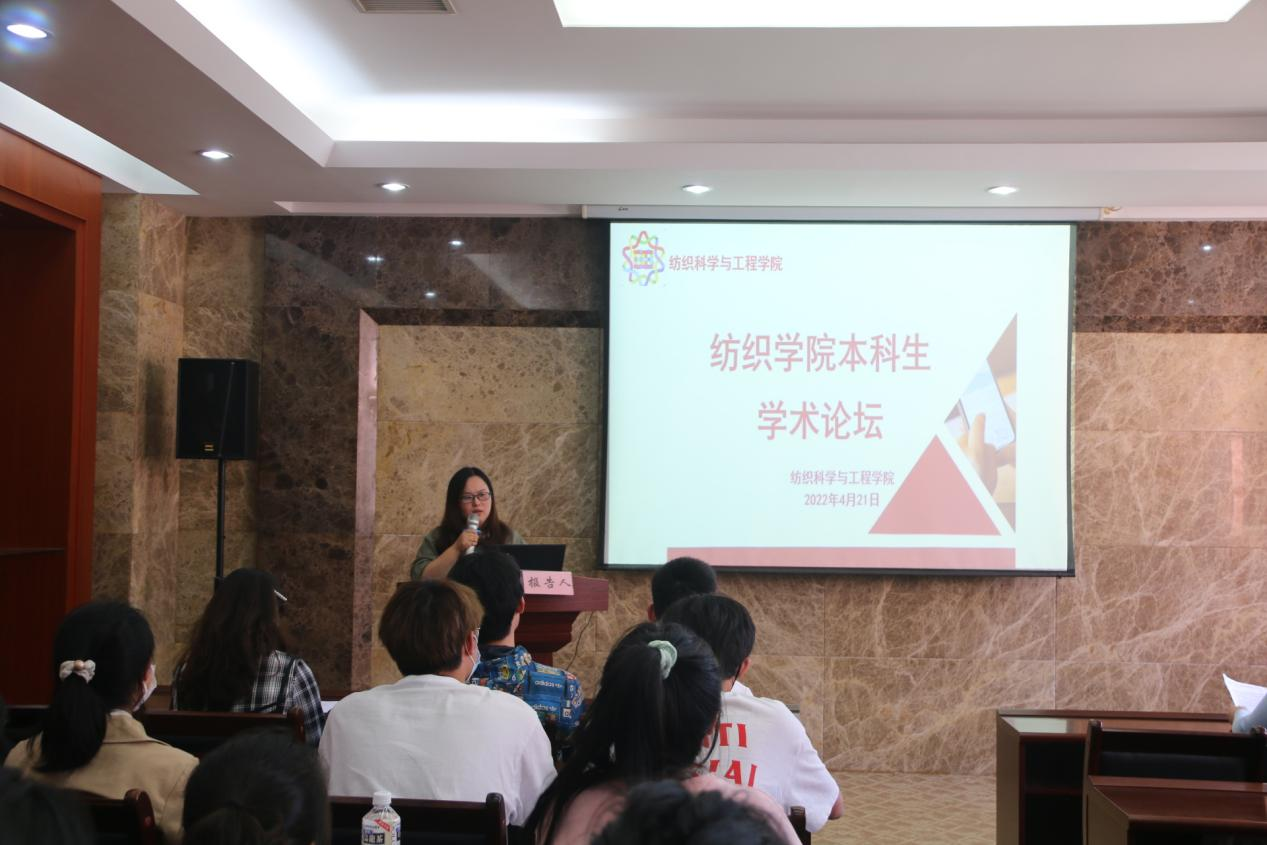 为深入推进科研育人实效,培养本科生创新意识和学术精神,营造浓厚的校园学术氛围。纺织学院于4月21日在8H302会议室举行了2022年度第一期本科生学术论坛。本次论坛由纺织学院团委书记张竣青主持,院长蔡光明、院党委副书记陈海、纺织工程系主任柯薇及各年级辅导员参加。