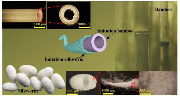 与华中科技大学团队合作,报道了一种简单和可扩展的制造策略,用于开发一种新型棉基复合纱(硅管/棉复合中空纱,表示为SCH)。受中空竹子和蚕茧的启发(图1),通过摩擦纺纱技术将连续中空硅管嵌入棉鞘,制成独特的芯鞘复合纱线结构,赋予SCH织物良好的抗皱性能、极高的回弹能力(85.07%)和持久的保温效果,解决了纤维素中空纱的塌陷起皱和保温不耐久问题。