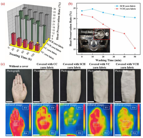文中应用ABAQUS CAE软件对SCH等4种纱线的传热性能进行了有限元分析,并对相应纱线的结构和性能(抗皱性、压缩回弹性、保温性、透气性等)进行了对比研究。如图2a、2b所示,分别为压缩和水洗处理后织物的保温测试,实验表明SCH织物具有良好的保温耐久性能;并且通过采用红外相机对织物进行隔热性能测试(图2c),进一步说明了SCH织物具有更优异的保温性能。