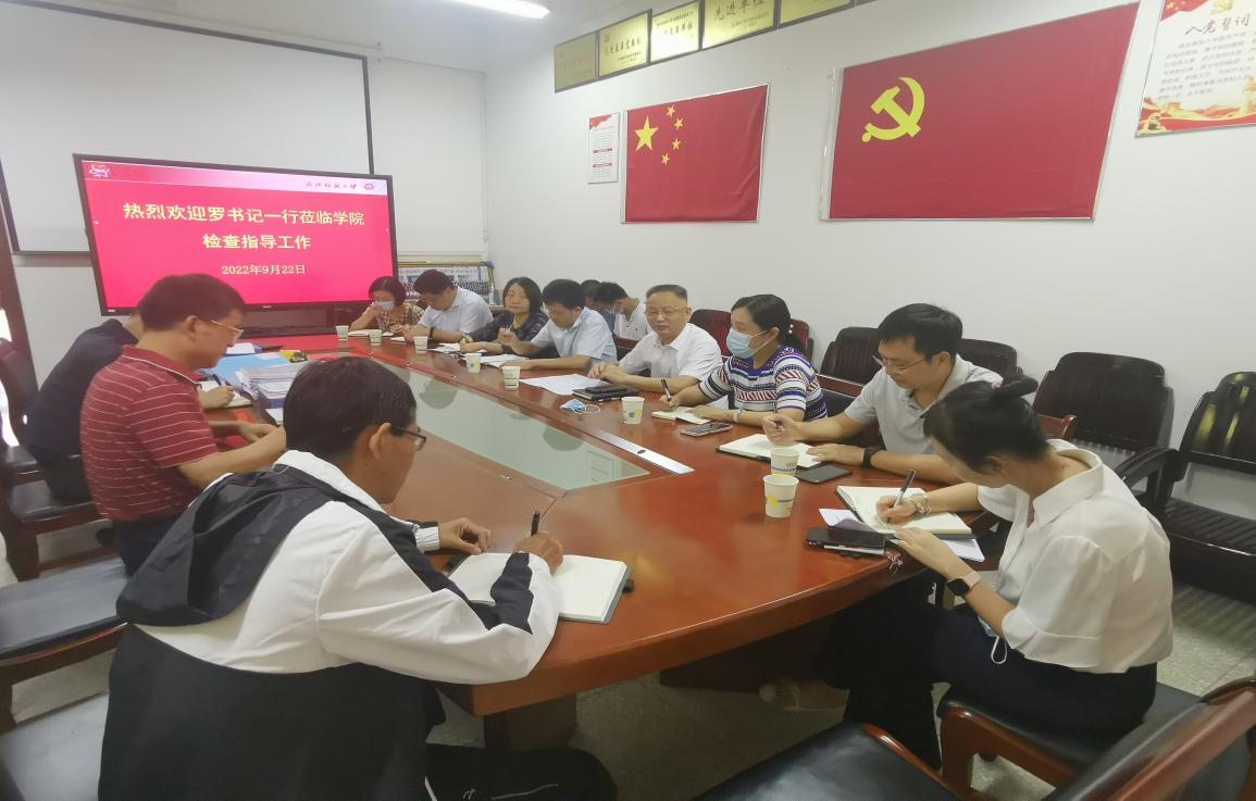 为进一步贯彻习近平总书记考察湖北重要讲话精神,推进落实省第十二次党代会部署,迎接党的二十大胜利召开,为学校平稳健康发展营造良好环境,9月22日下午,校党委副书记、副校长罗锦银带队莅临纺织学院开展安全稳定工作督导,纪委、宣传部、统战部、学工部、保卫处、信息技术中心、资产处等部门负责人陪同。