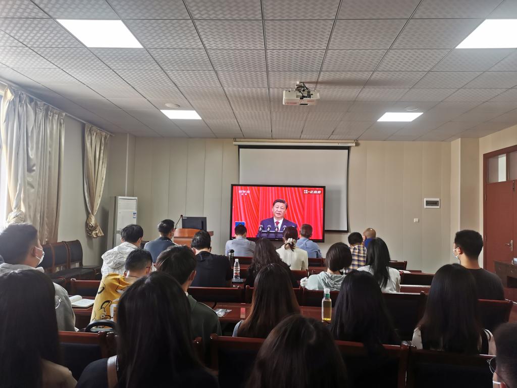 在三大同步集中观看会场,全体师生代表聚精会神听报告,认真学习党的二十大精神并作笔记,真正融入到党的二十大盛会召开的热烈浓厚氛围中。在全程收看党的二十大开幕会直播后,学院党委副书记李亮表示,在新时代、新征程,学院将坚持立德树人、竭力改革创新,立足学生实际需求办好特色教育,全力为推动学校高质量发展而奋斗,为培养更多堪当民族复兴重任的社会主义建设者和接班人贡献力量。