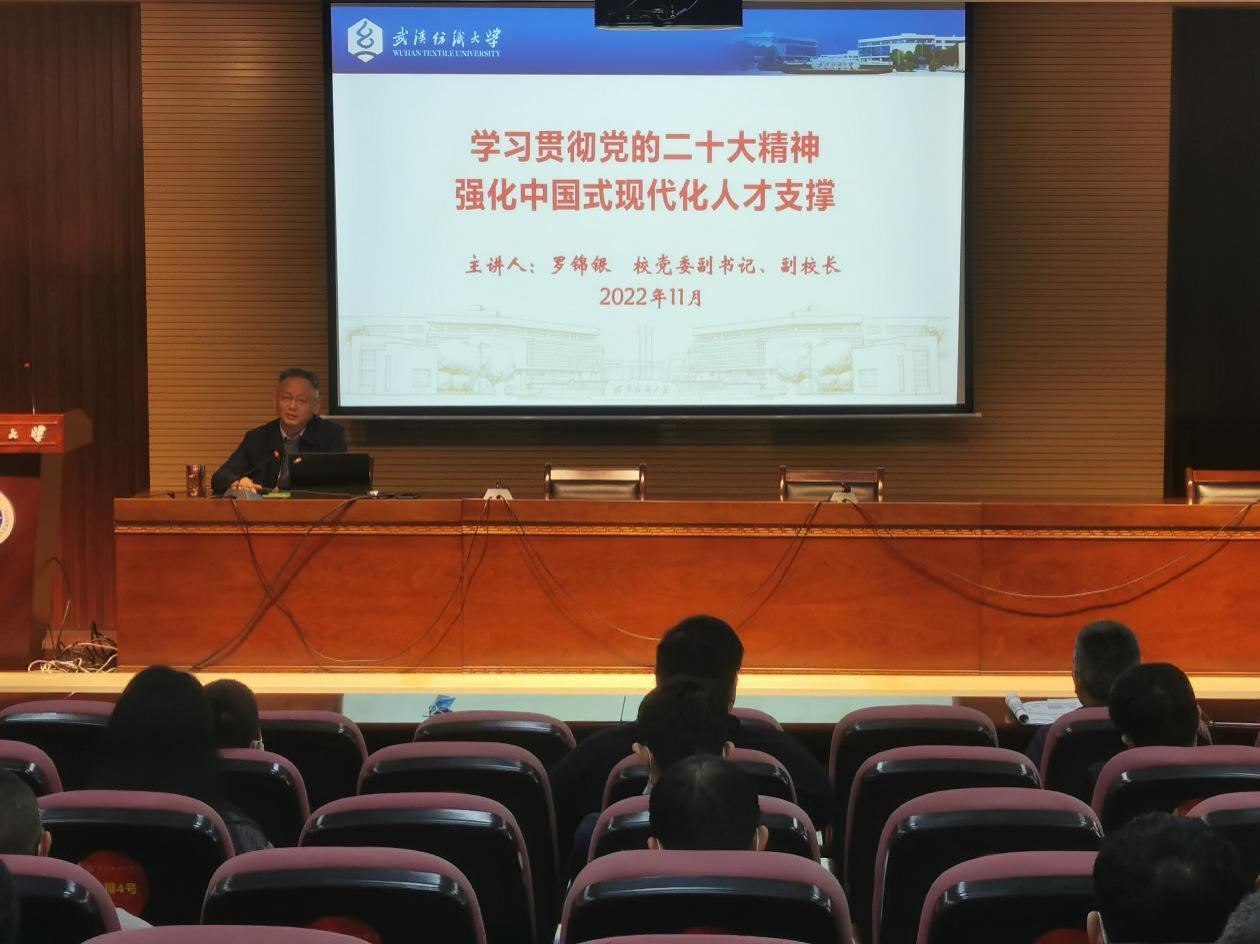 11月24日下午,纺织学院在行政楼报告厅举行党的二十大精神宣讲报告会。学校党委副书记、副校长罗锦银作宣讲报告,纺织学院全体教职工参加报告会,报告会由纺织学院党委书记朱张军主持。