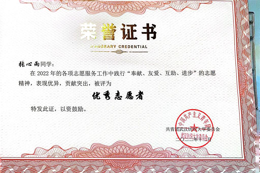 “优秀志愿者”、武汉市东湖高新区“疫情防控志愿者”等荣誉称号。作为学院团委学生会主席联合社区进行多次志愿活动,组织志愿捐衣,为贫困山区孩童送温暖等活动,在校期间累计服务时长约500小时。