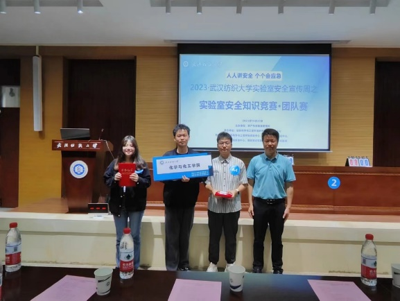 、材料科学与工程学院、环境工程学院、化学与化工学院、国家重点实验室、教育部重点实验室六支队伍组成。通过第一赛段—群雄逐鹿,第二赛段—三强鼎立,第三赛段—王者争霸,全方位实验室安全知识答题、竞赛抢答,决出胜负,其中化学与化工学院队伍获得一等奖,环境工程学院、教育部重点实验室获得二等奖,其他参赛队伍获得三等奖。比赛过程中,设立现场观众互动环节,同学们踊跃参与到活动中。比赛结束后,举行颁奖仪式,张艳波老师、孙磊老师和材料科学与工程学院实验中心主任陈祖玉老师分别为团队赛一等奖、二等奖、三等奖获奖同学颁发荣誉证书和奖品。