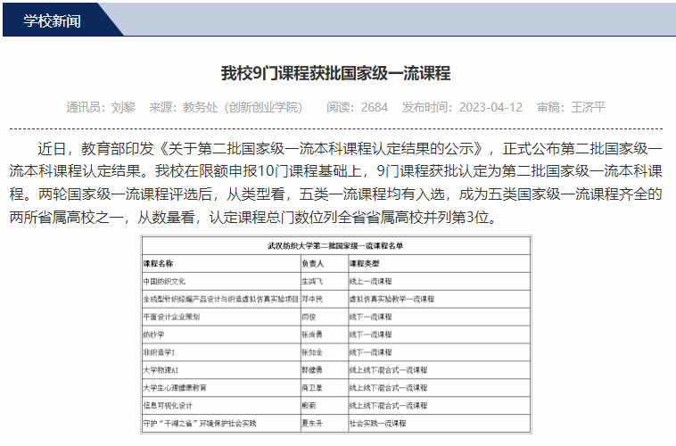 5.获批国家级一流课程3门、中纺联教学成果奖11项,教育教学再提水准。《纺纱学》《非织造学Ⅰ》《全成型针织经编产品设计与织造虚拟仿真实验项目》获批国家级一流课程,获批省级一流课程4门,出版教材2部。获批中国纺织工业联合会纺织高等教育教学成果奖11项,其中特等奖3项、一等奖3项、二等奖5项。