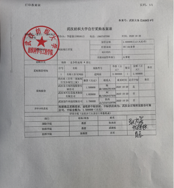 2020年纺织科学与工程学院名师工作室建设的“肉视频 自行采购备案表”扫描件见下图,现予以公示7个工作日。公示日期为2020年10月21日-10月29日。公示期间,如对采购结果有异议,请于10月29日16:00前联系学院办公室反映。