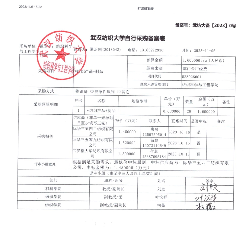 关于纺织产品、制品采购询价备案公示