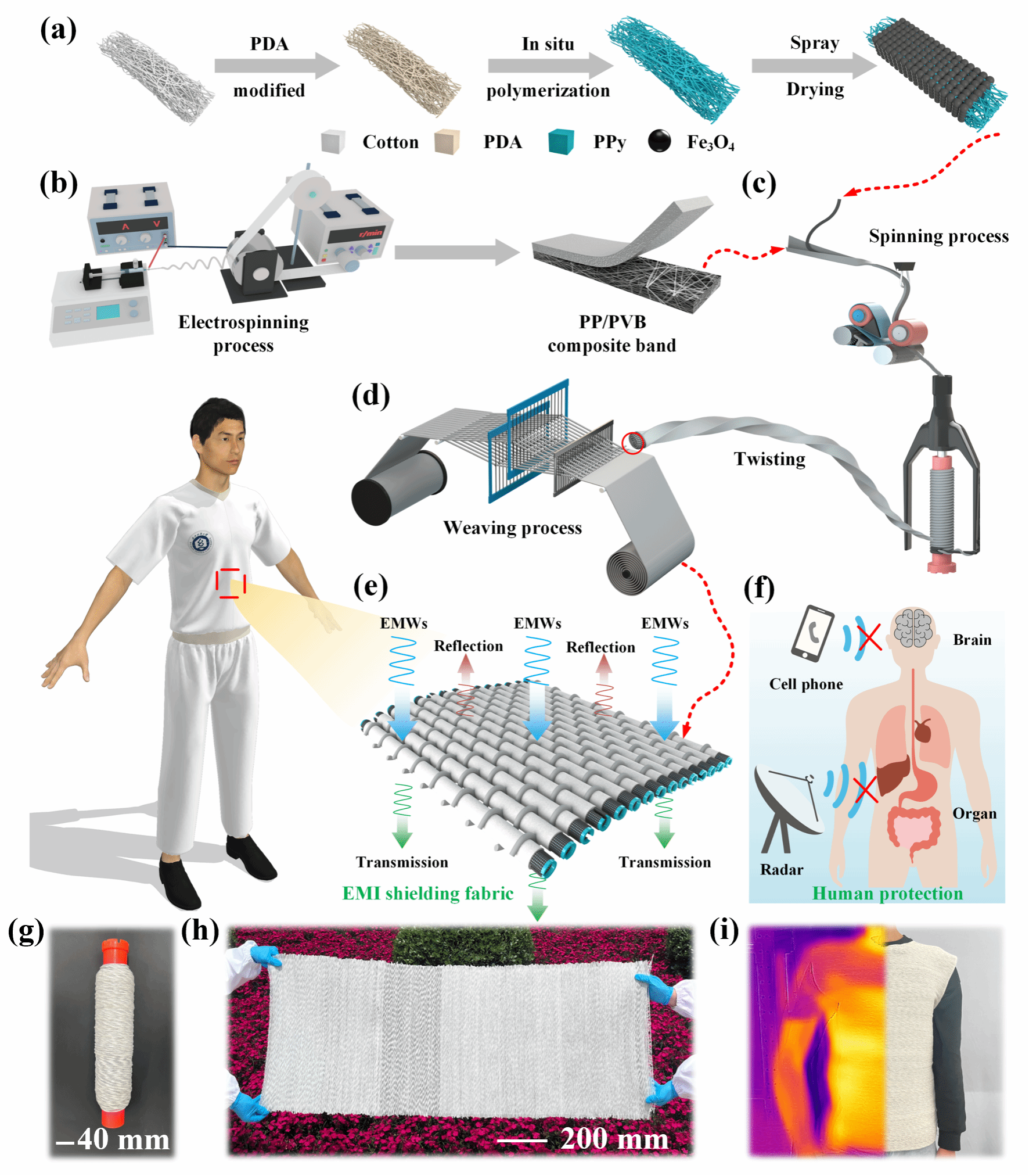 当下第五代通讯技术的快速布局,电子设备产生的电磁污染日益严峻。传统电磁屏蔽材料具有高刚性和可加工性差的缺点,不能满足日益增长的可穿戴电磁屏蔽系统的要求。开发高柔性、耐用、可剪裁的屏蔽服装已引起广泛的研究兴趣。无机材料Fe3O4粉体粒子具有优异的电磁屏蔽功能、聚合物PPy粒子具有优异的导电和自发热功能,然而功能粉体粒子存在难以柔性稳态、大量快速纺纱制造的共性加工难题。针对该技术难题,纺纱新材料与先进加工课题组创新研发了粒子流纺纱技术,并利用该技术将Fe3O4、PPy等粉体粒子材料,规模化加工制备成纳米Fe3O4/聚吡咯(PPy)/棉/聚丙烯(FP@CP)芯鞘纱线及织物,用于电磁屏蔽和热管理。产品结构与性能研究结果表明:FP@CP纱线及织物展现良好的耐用性(50次洗涤和465次耐磨),并具有高达47 dB(SET)的电磁反射/吸收双模式屏蔽性能。此外,该纱线在3 V电压条件下加热10 s可达到105℃,展现其高效的焦耳热性能,为多功能电磁防护纺织品的商业化发展开辟了一条经济有效的途径。