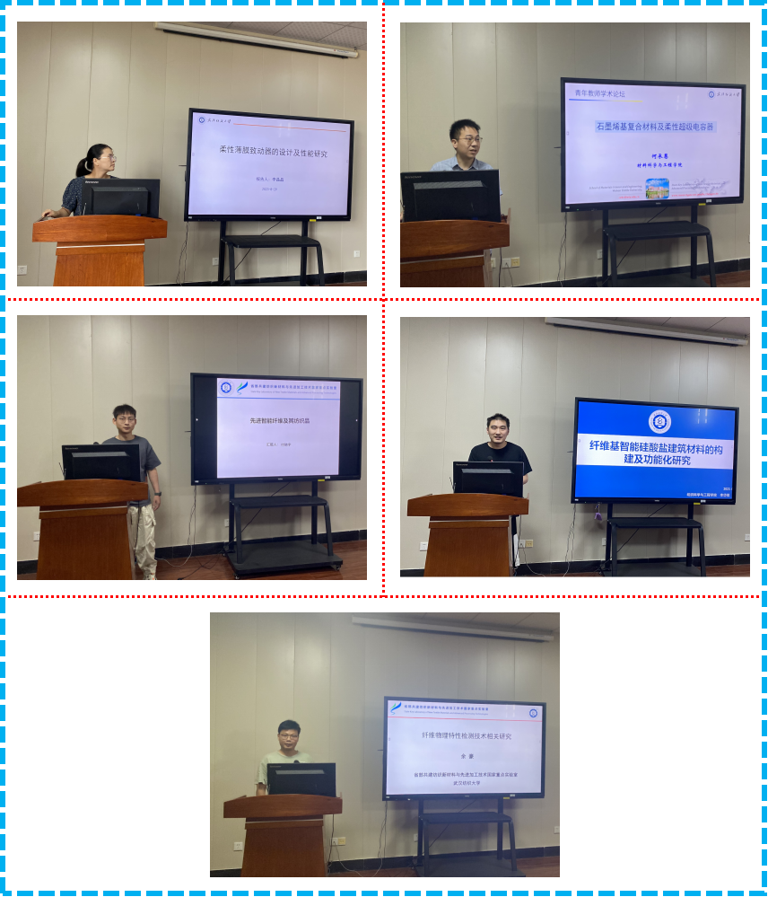 本次学术沙龙活动中,李晶晶、何承恩、李岱祺、付驰宇、余豪共5位老师依次作为主讲人分别以“柔性薄膜致动器的设计及性能研究”、“石墨烯基复合材料及柔性超级电容器”、“纤维基智能硅酸盐建筑材料的构建及功能化研究”、“先进智能纤维及其纺织品”、“纤维物理特性检测技术相关研究”为题作了报告,主讲内容涵盖了纤维基智能建筑材料、智能可穿戴纺织品、纤维物理特性检测技术等领域,契合了“智能化功能纺织”主题,并和在场师生围绕报告技术方案、关键科学问题、创新性研究方向、基金项目申请、技术与项目合作、成果转化等方面展开了深入的探讨,现场气氛热烈。