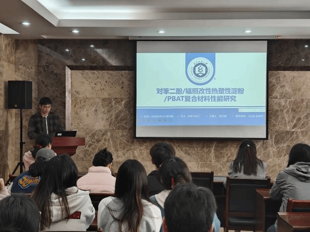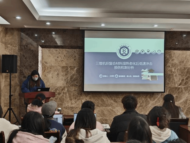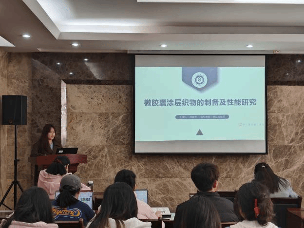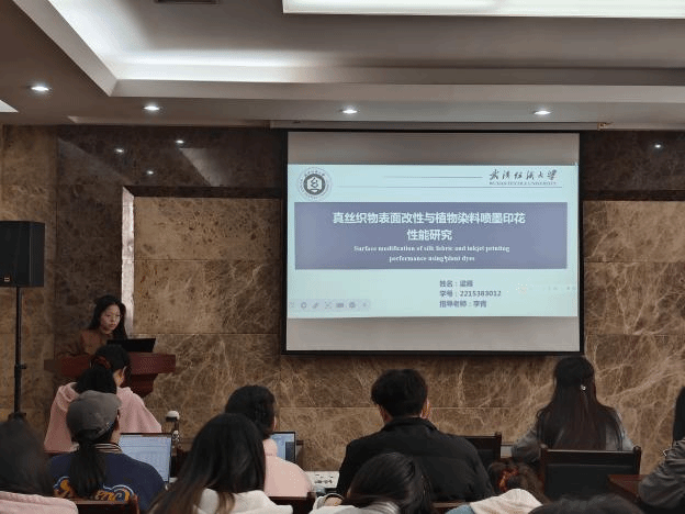 论坛上,孙治国、史纳蔓、梁雁、潘钰、龚婉琴、王家轩和郑冰倩七位同学依次介绍了自己的研究课题和目前取得的研究进展,并分享了自己的科研经验。主讲同学的研究课题包括热塑性淀粉/PBAT复合材料、液态金属基纤维复合材料、真丝织物与植物染料喷墨印花、SnO2中空纤维负载纳米金属、微胶囊涂层织物、三维机织复合材料、UHMWPE纤维层合板,契合了“纺织新材料及绿色加工”主题,代表了学院最新研究进展,参会人员积极提出问题和建议,营造了良好的学术氛围。