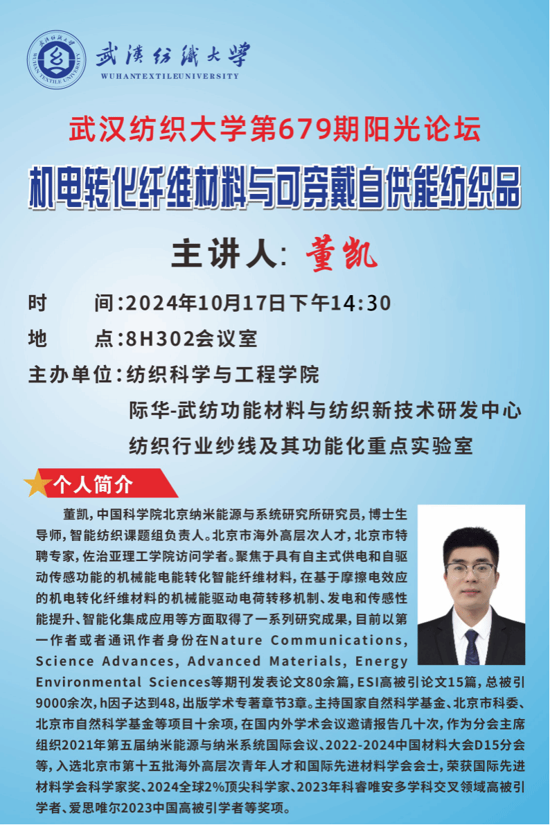 董凯,中国科学院北京纳米能源与系统研究所研究员,博士生导师,智能纺织课题组负责人。北京市海外高层次人才,北京市特聘专家,佐治亚理工学院访问学者。聚焦于具有自主式供电和自驱动传感功能的机械能电能转化智能纤维材料,在基于摩擦电效应的机电转化纤维材料的机械能驱动电荷转移机制、发电和传感性能提升、智能化集成应用等方面取得了一系列研究成果,目前以第一作者或者通讯作者身份在Nature Communications, Science Advances, Advanced Materials, Energy Environmental Sciences等期刊发表论文80余篇,ESI高被引论文15篇,总被引9000余次,h因子达到48,出版学术专著章节3章。主持国家自然科学基金、北京市科委、北京市自然科学基金等项目十余项,在国内外学术会议邀请报告几十次,作为分会主席组织2021年第五届纳米能源与纳米系统国际会议、2022-2024中国材料大会D15分会等,入选北京市第十五批海外高层次青年人才和国际先进材料学会会士,荣获国际先进材料学会科学家奖、2024全球2%顶尖科学家、2023年科睿唯安多学科交叉领域高被引学者、爱思唯尔2023中国高被引学者等奖项。