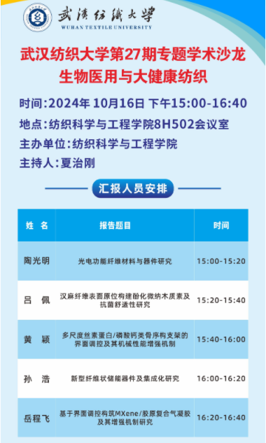 本次学术沙龙活动中,陶光明、吕佩、黄颖、孙浩、岳程飞共5位老师依次作为主讲人分别以“光电功能纤维材料与器件研究”、“汉麻纤维表面原位构建酚化微纳木质素及抗菌舒适性研究”、“多尺度丝素蛋白/磷酸钙类骨序构支架的界面调控及其机械性能增强机制”、“新型纤维状储能器件及集成化研究”、“基于界面调控构筑MXene/胶原复合气凝胶及其增强机制研究”为题作了报告,主讲内容涵盖了光电功能纤维材料与器件、汉麻纤维、丝素蛋白、纤维状储能器件、气凝胶等领域,契合了“生物医用与大健康纺织”主题,并和在场师生围绕报告技术方案、关键科学问题、创新性研究方向、基金项目申请、技术与项目合作、成果转化等方面展开了深入的探讨,现场气氛热烈。