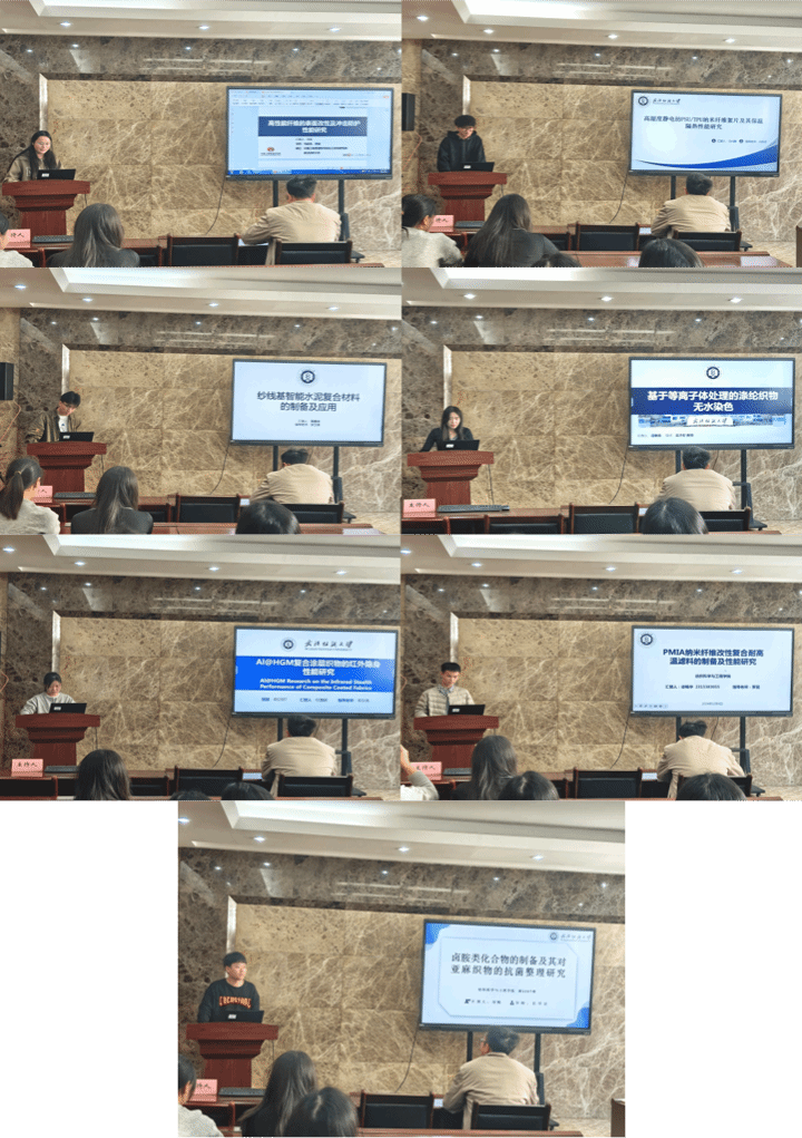 论坛上,马猛、刘帆、徐畅华、杜慧颖、雷雅茹、黄嘉琪、马兴鹏七位同学依次介绍了自己的研究课题和目前取得的研究进展,并分享了自己的科研经验。主讲同学的研究课题包括高性能纤维、卤胺类化合物、PMIA纳米纤维改性复合耐高温滤料、复合涂层织物、涤纶织物、纱线基智能水泥复合材料、高湿度静电纺PSU/TPU纳米纤维絮片,契合了“纺织新材料及绿色加工”主题,代表了学院最新研究进展,参会人员积极提出问题和建议,营造了良好的学术氛围。