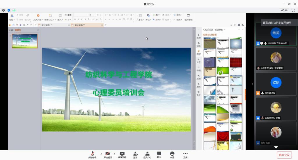 2020年7月3日晚9点,纺织学院织心湾心理工作站在腾讯会议云端开展了本学期第二次心理委员培训。本次培训的主题是“正确认识自己”,主讲人是织心湾心理工作站指导老师严蔷薇老师,织心湾站长曾欣怡主持。