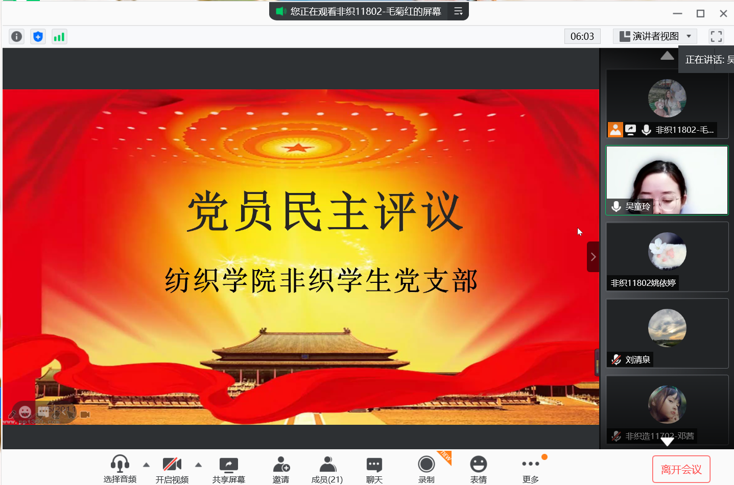 12月28日晚,非织学生支部通过线上+线下相结合的方式召开了度民主评议党员活动总结交流会,纺织学院党委副书记陈海参会,吴童玲老师主持了会议。会上,吴老师分别从“思想、 学习、工作、生活、廉洁、服务”几方面作了述职汇报,既肯定了一年的工作,又提出了未来的发展方向。而后全体党员认真对本小组进行了坦诚、深刻的作批评与自我批评并进行了无记名测评。