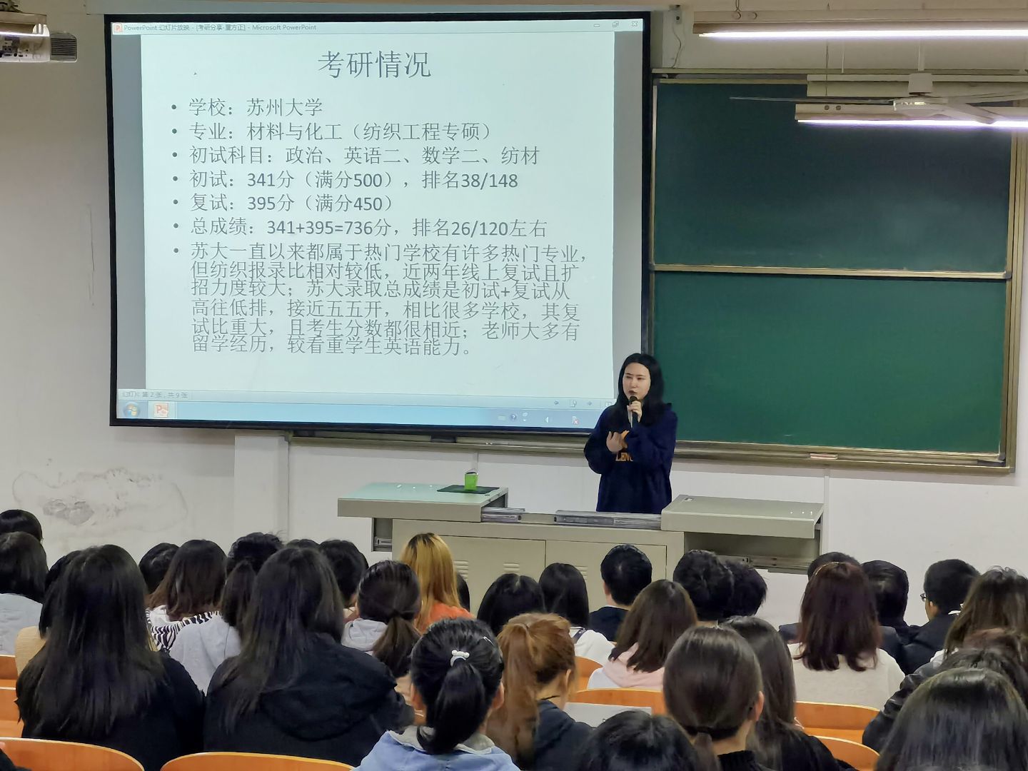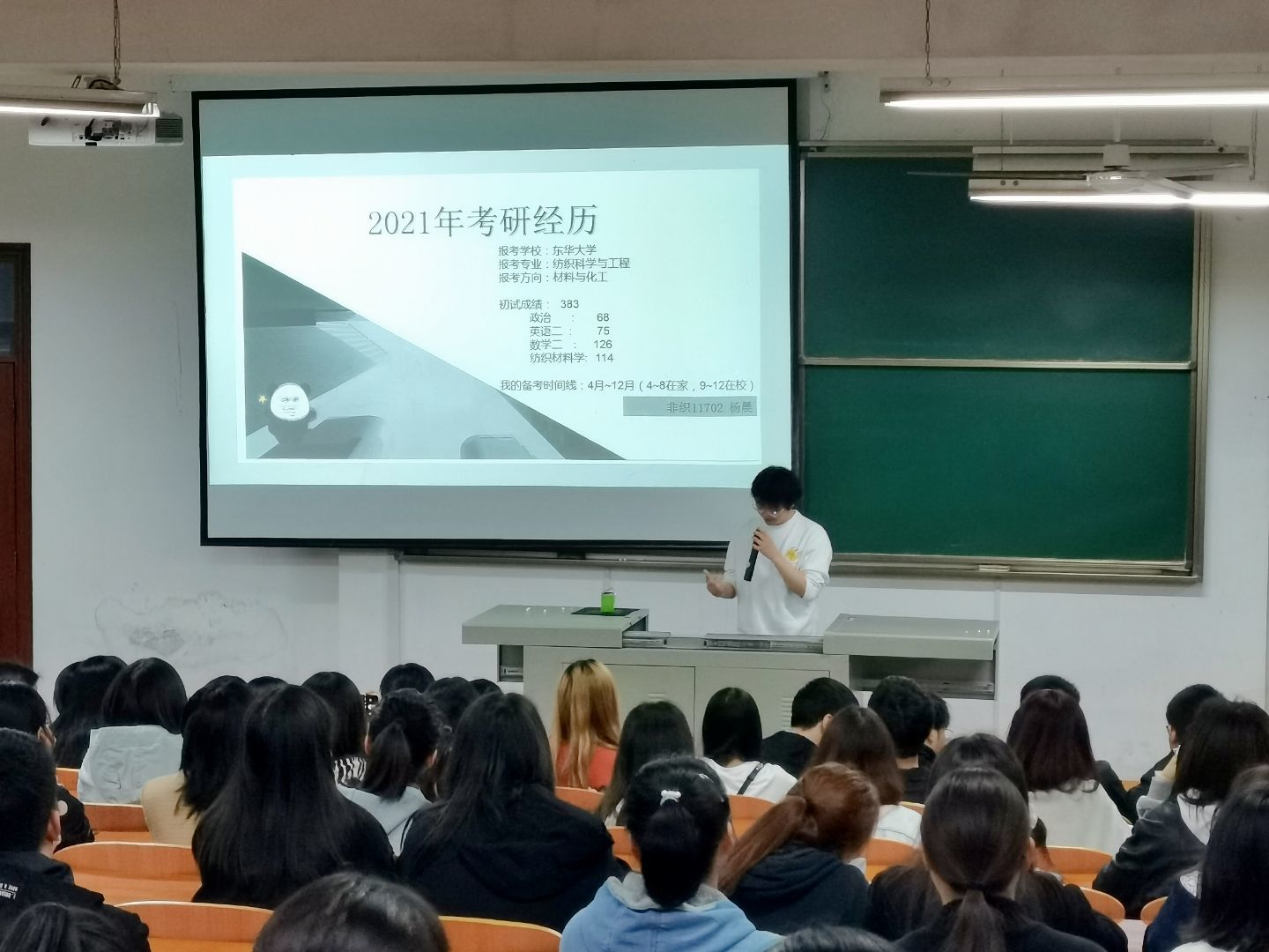 为帮助同学们对考研建立起清晰的认识,纺织学院于4月12日18:30在8FT-101举办朋辈领航-考研经验交流会。交流会邀请到杨晨、童方正、徐兴、赵西雨四位成绩优异的同学为学生讲述考研历程与个人经验。