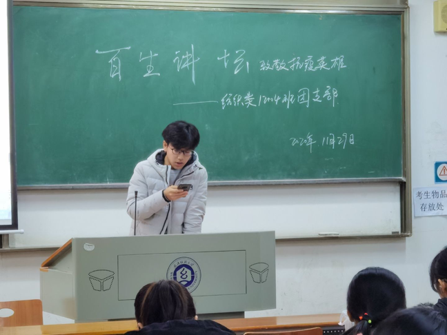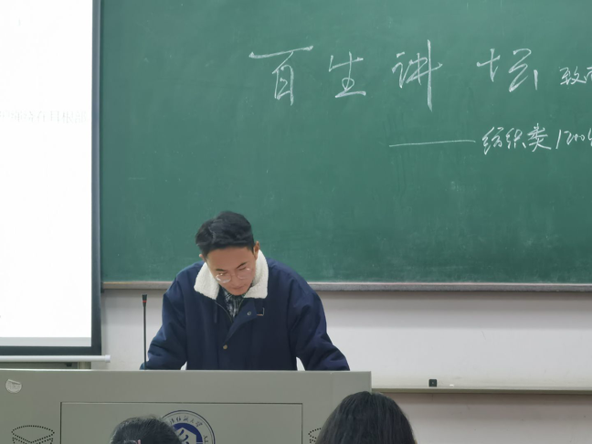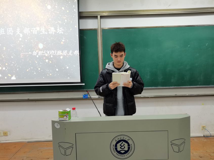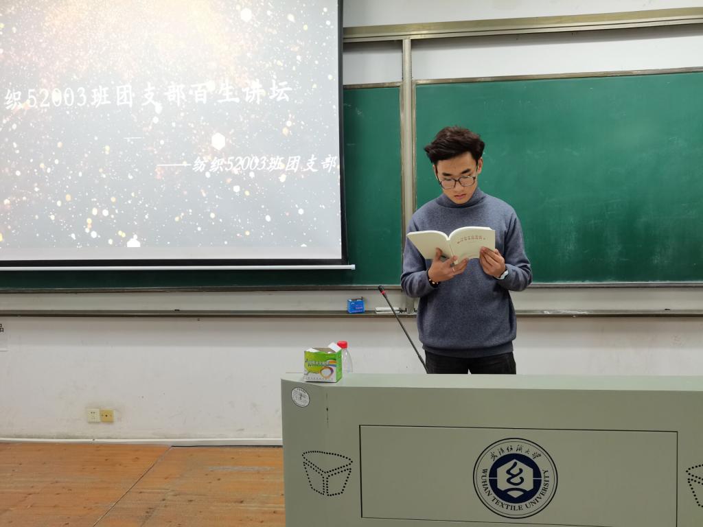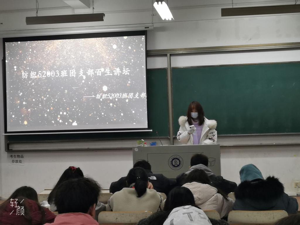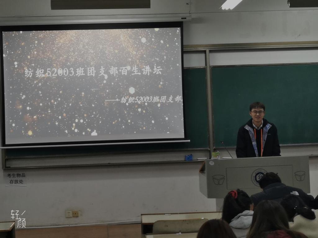 为深入爱国主义教育,让青年牢记历史使命,明确责任担当,实现中华民族伟大复兴中国梦贡献。11月29日晚上七点,纺织学院纺织12001— —52003班崇志楼开展了“百日讲坛”主题团日活动。本次团日活动由各班班委主持,辅导员吴童玲老师指导。